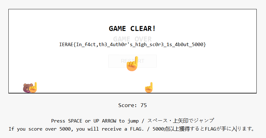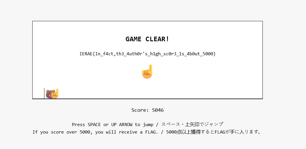 We are given a variant of the Chrome Dino Game with bears and wagging fingers. We’re told that if we beat 5000 points, we will recieve the flag. I did solve the challenge with my expert dino game skills, but I also wanted to see if I could solve it in a more technical way.