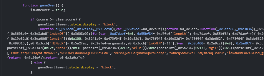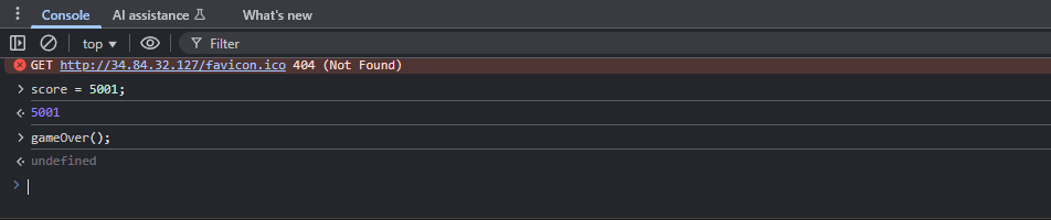 I used Chrome’s developer console to change the value of our score with score = 5001;, and then trigger the game ending with gameOver(). This showed the flag over top of the previous Game Over loss message, which is why it looks a little glitchy.
