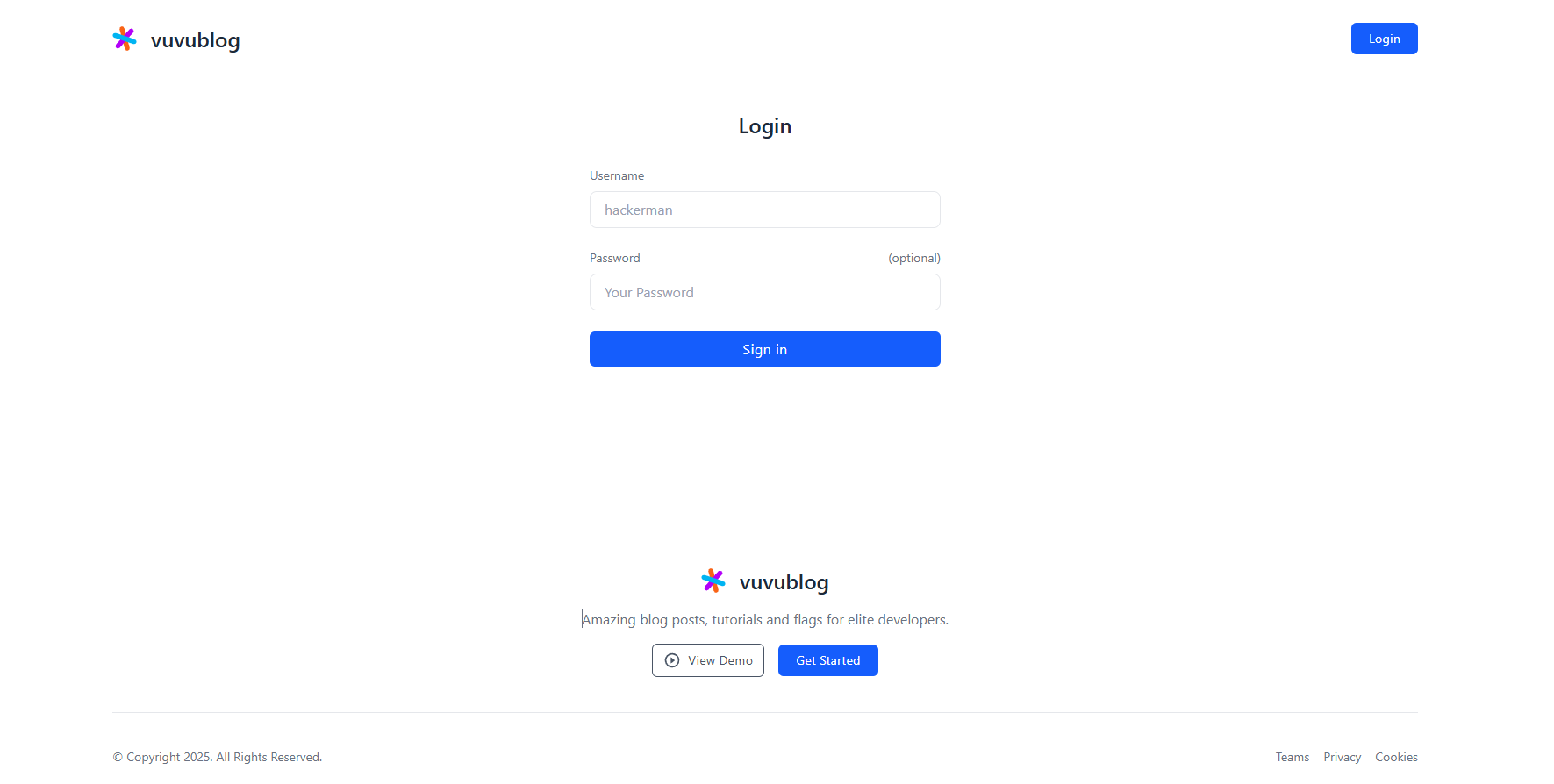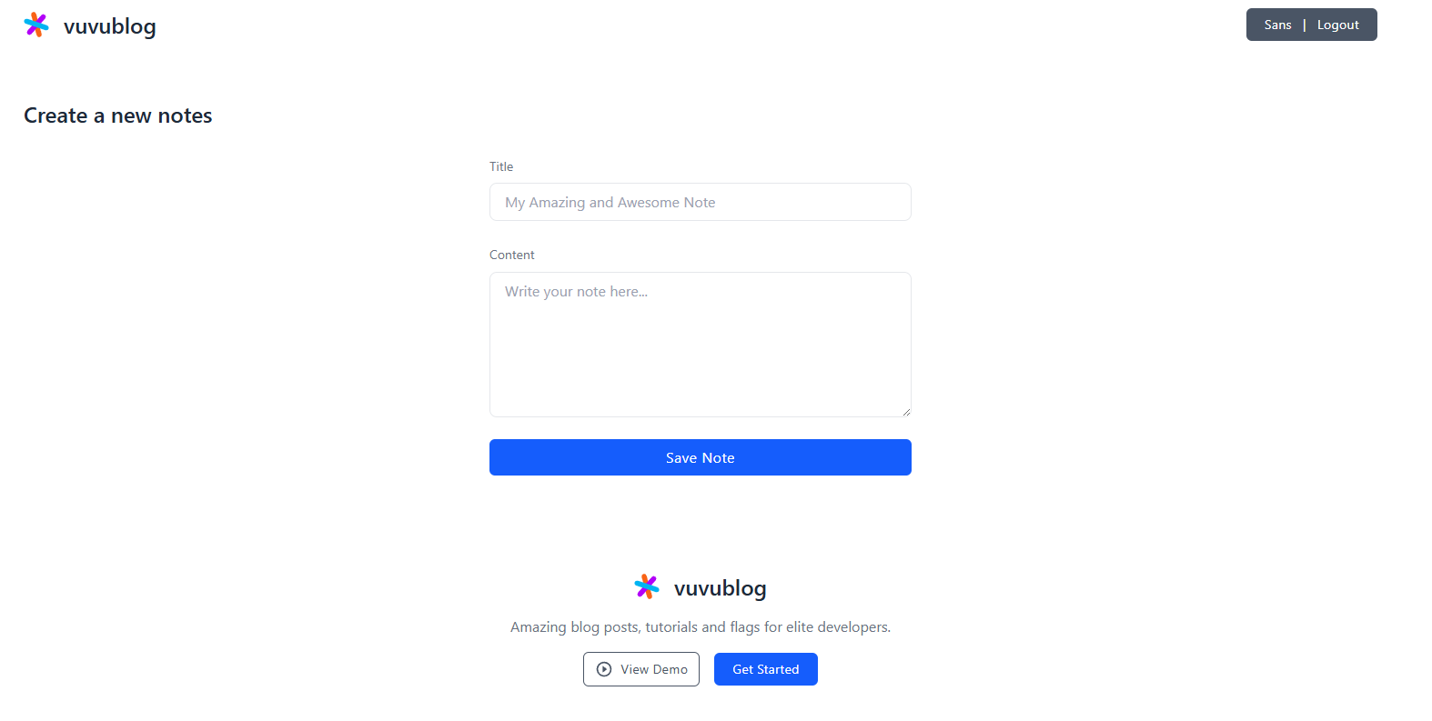 We are given the Vuvublog website. In the website, you can see a lovely demo, and, once you log in, you can create notes. When you create a note, it displays the title, content, and a fun image.