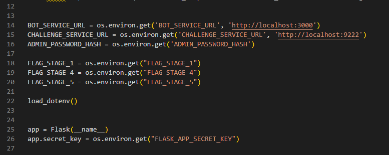We are also given the files behind the websites. After a little poking around, we determine that the flag for this first stage is stored in an environmental variable. If we can figure out a way to get the website to leak the .env file, we can get the flag.