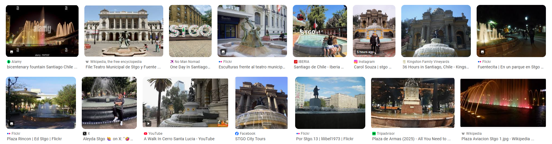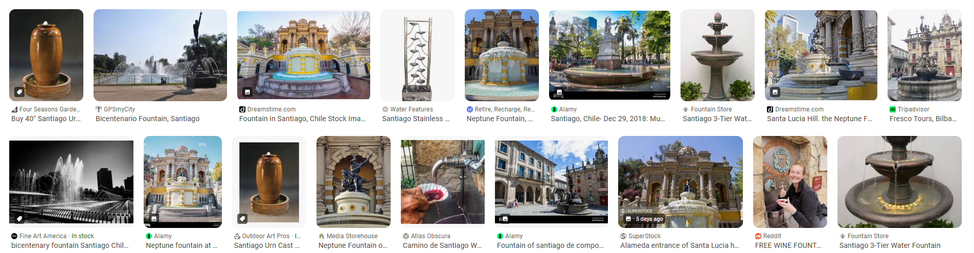 When I added the keyword “fountain” to the search, I didn’t find many helpful results. This was because Google search wanted to autocorrect “stgo” to “santiago”.