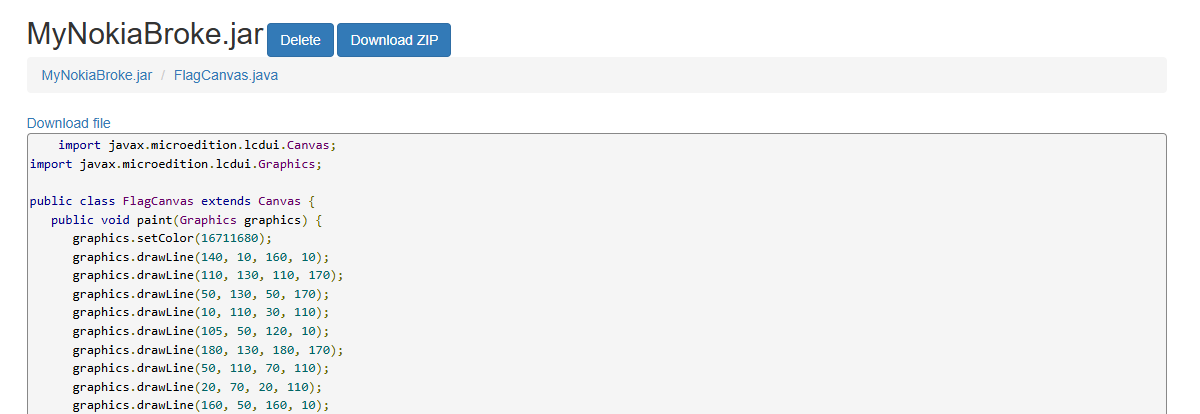 After uploading the file into Decompiler.com, I see two main files: AppMIDlet.java, and FlagCanvas.java. I decide to check out the file with flag in the name.