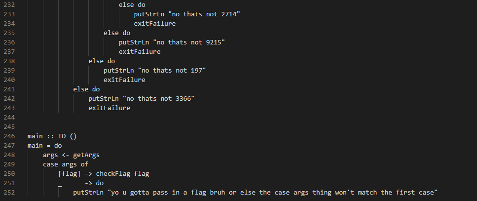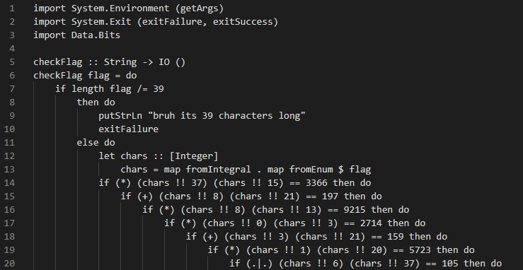 We are given a script in .hs, which I learned meant Haskell Script. According to FileFormat.com, Haskell is an advanced purely-functional open-source programming language. I did a bit of research, and some ChatGPT-ing to understand the syntax, because who likes reading docs? (spoiler alert: nobody). It seemed to be essentially a logic challenge, you just needed to figure out which values fit the long list of instructions.
