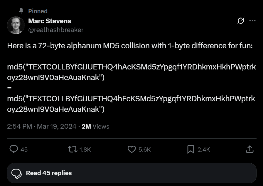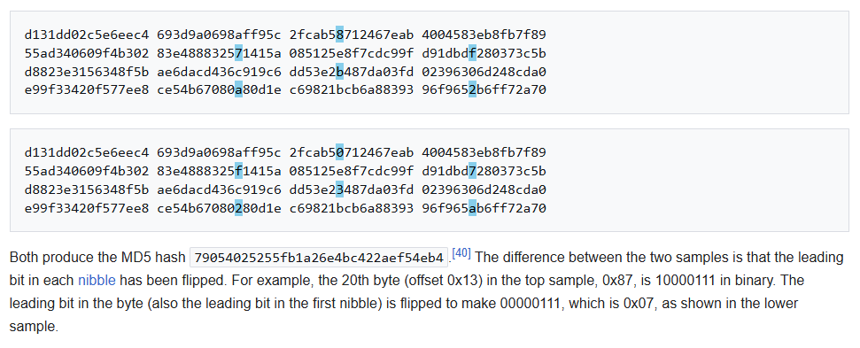 On Twitter, I find this MD5 hash collision: