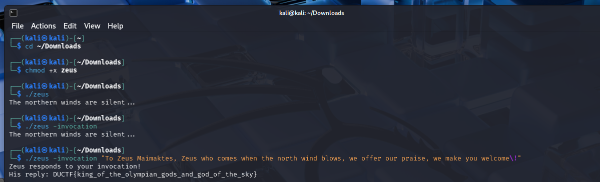 The flag is DUCTF{king_of_the_olympian_gods_and_god_of_the_sky}.
